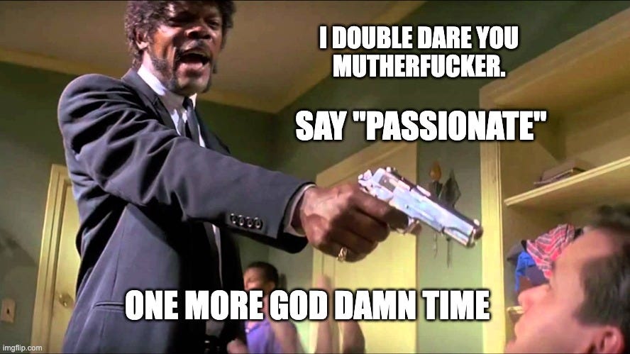 Am I “passionate” about that? Well, I give everything I have while I’m working on it. I get a ton out of it. But I couldn’t bring myself to say passionate because