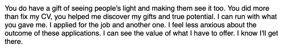 I played Cerys’ story back to her in a way that made sense. All those otherwise disparate bits, why she does what she does, the reasons why she’s great at it, the authentic value she provides - all laid out.